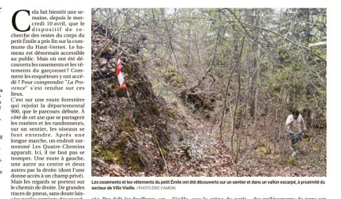 might be an idea to look at this in conjunction with weather maps showing any severe winds or other weather events in the area since his departure..Mort du petit Emile : le sentier où a été retrouvée une partie du corps au cœur de nombreuses interrogations (extrait traduction Reverso)