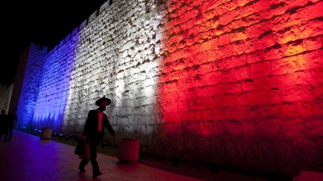 As was part of Jerusalem's Old City wall, to show solidarity after the attacks in Paris.