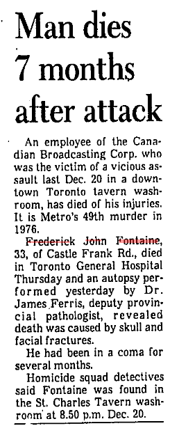 The victim was discovered inside the St Charles Tavern, suffering from blunt trauma. The victim was transported to hospital, where he eventually died from his injuries on July 15, 1976.