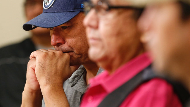 Norway House resident Leon Swanson weeps at a press conference last week, where Manitoba's former aboriginal affairs minister Eric Robinson, centre, announced Swanson and David Tait Jr., right, were switched at birth in 1975 when their mothers gave birth at Norway House Indian Hospital. (THE CANADIAN PRESS/John Woods)