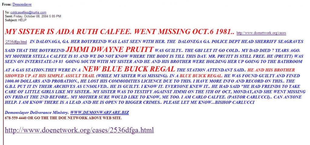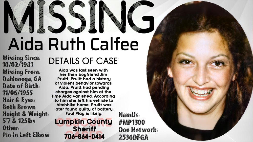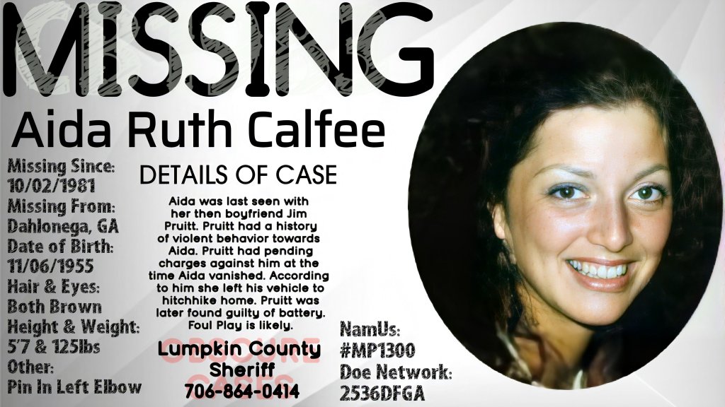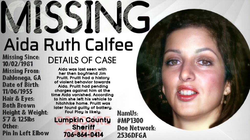 Aida Calfee took out a warrant in Cobb County in 1981 against her boyfriend, stockbroker Jim Pruitt, 32, for beating and choking her. Saying she had not taken out a warrant after prior beatings because of fear, she told prosecutors that Pruitt was trying to get her to drop charges. She disappeared five days before Pruitt's arraignment and has been missing ever since. Pruitt was found guilty of battery.