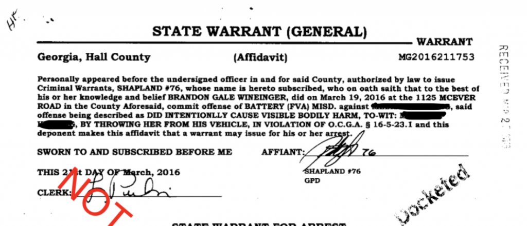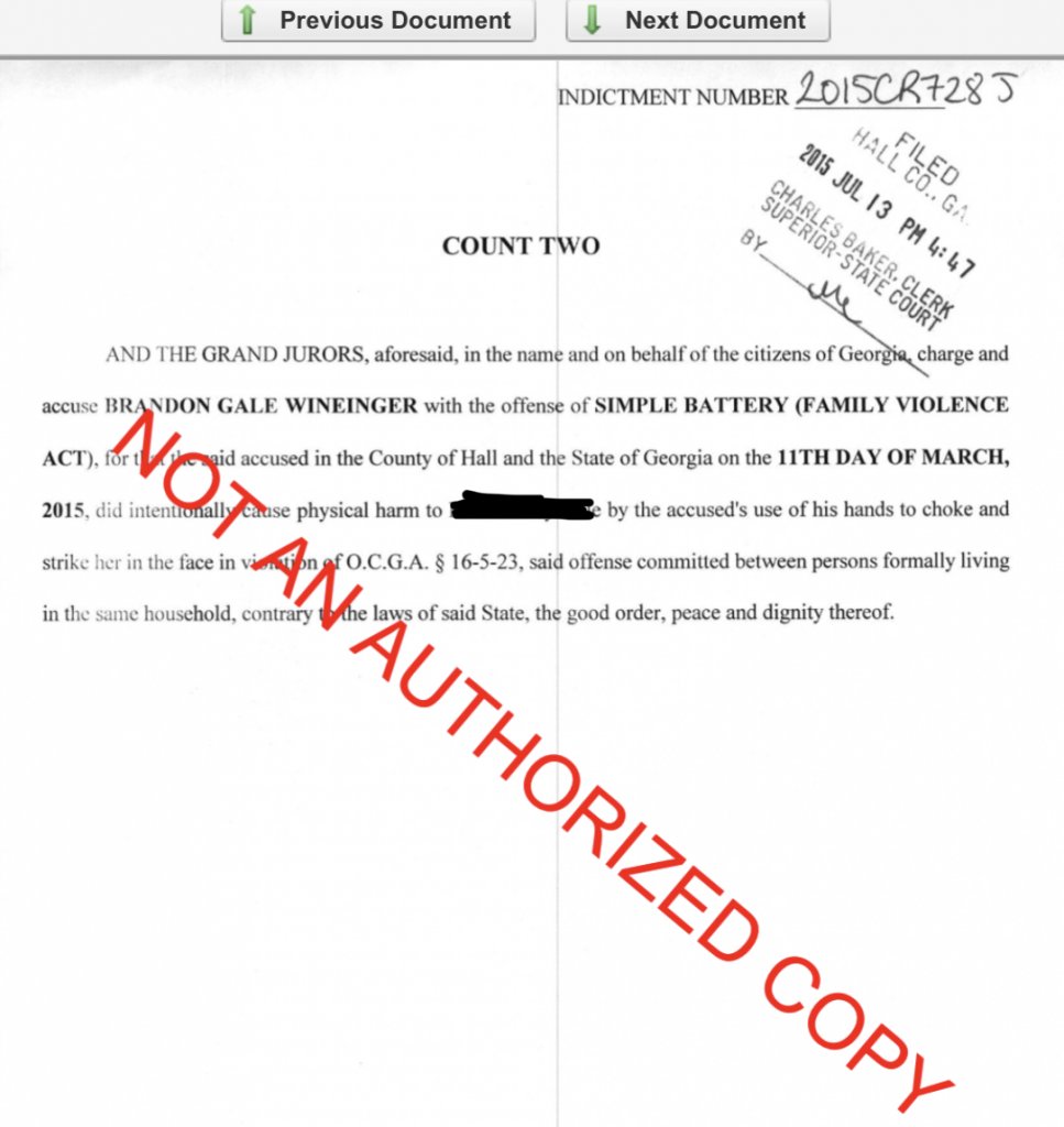 So, in Hall County, Wineinger has numerous charges going back to the early 2000s. The vast majority are traffic violations (blocking intersection, speeding, no seatbelt, window tint, running red light, etc.). However, in 2005, he was charged with simple battery against his mother, for which he plead nolo contendre (he admitted no guilt, but paid a fine) and was not to use drugs/alcohol, possess a weapon, or come on his mother’s property.