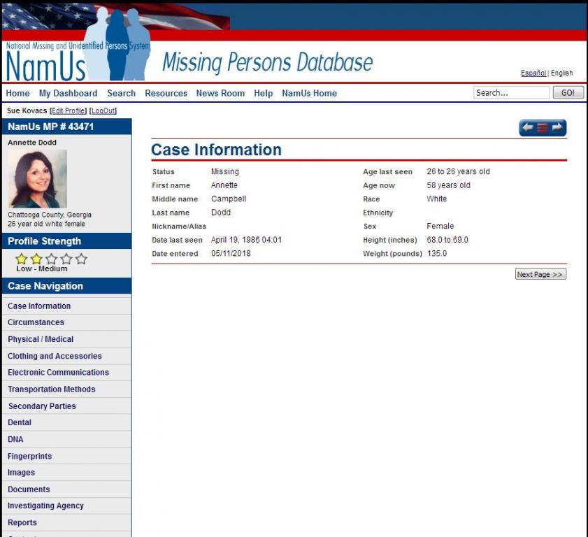 I just did a search on NamUs and she isn't coming up - I even did a search for females named Annette - 15 female are listed but not this Annette.- very weird.