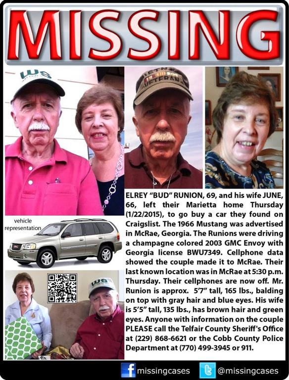 "The GBI and Georgia State Patrol have joined deputies from Telfair, Wheeler and Jeff Davis counties in the search for a Marietta couple who are missing since Thursday after going to McRae to buy a car from someone through Craigslist."