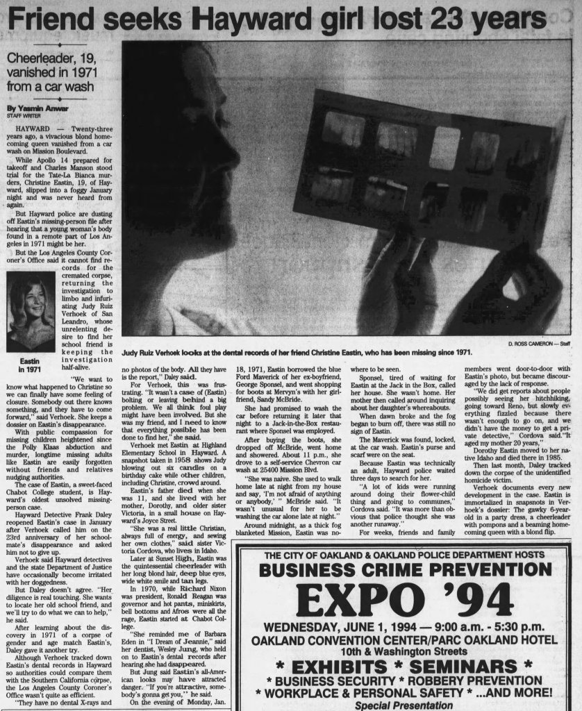 Yasmin Anwar, "Friend seeks Hayward girl lost 23 years," Oakland Tribune, 31 May 1994, A11.