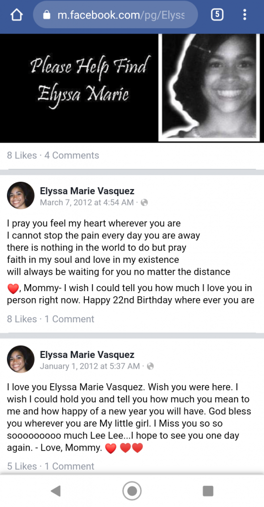 For years after her disappearance, Elyssa was classified as a runaway; her case has since been reclassified to an endangered missing child. Few details are available in her case.