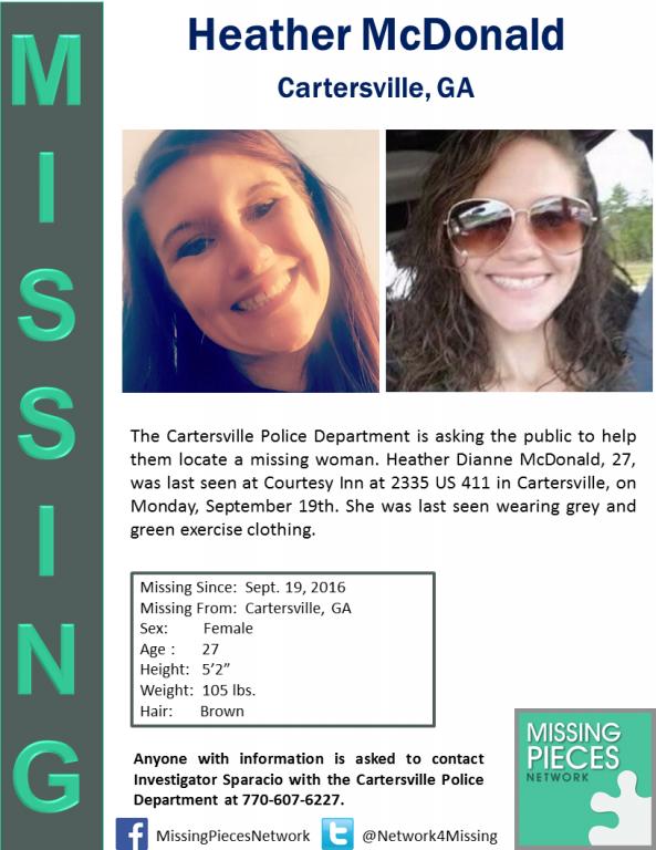 https://www.facebook.com/heathermcd333Heather Dianne McDonald, 27, was last seen at Courtesy Inn at 2335 U.S. 411 in Cartersville on Monday, Sept.19.