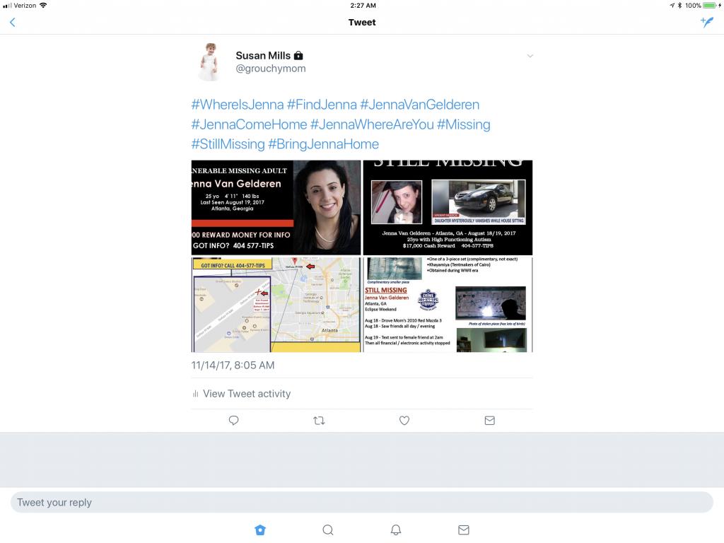 I have included an example of one of my tweets for Jenna below. For those not familiar with Twitter you can use up to 4 photos/images per tweet and hash tags are what follows # there can be no spaces between characters in a hashtag ex: #FindJenna or #BringJennaHome hash tags are how people search for tweets that interest them. If I was to find things going on in Atlanta I search for #Atlanta #Missing. #StillMissing are great choices. Be creative but remember simple reaches more people. Once a day I try to remember to tweet 4 tweets each with 1 pic so it stands out and the fifth tweet is all 4 pics just to drive the msg home. It is quick and easy and better yet ppl will see it. We can’t all post flyers but we can all tweet the flyers you can save the pics from here at WS or go to the Find Jenna fb page or go to the Jenna twitter acct and just hit retweet to send from there. If you are tired of waiting for info spend a minute or 2 tweeting Thanks
