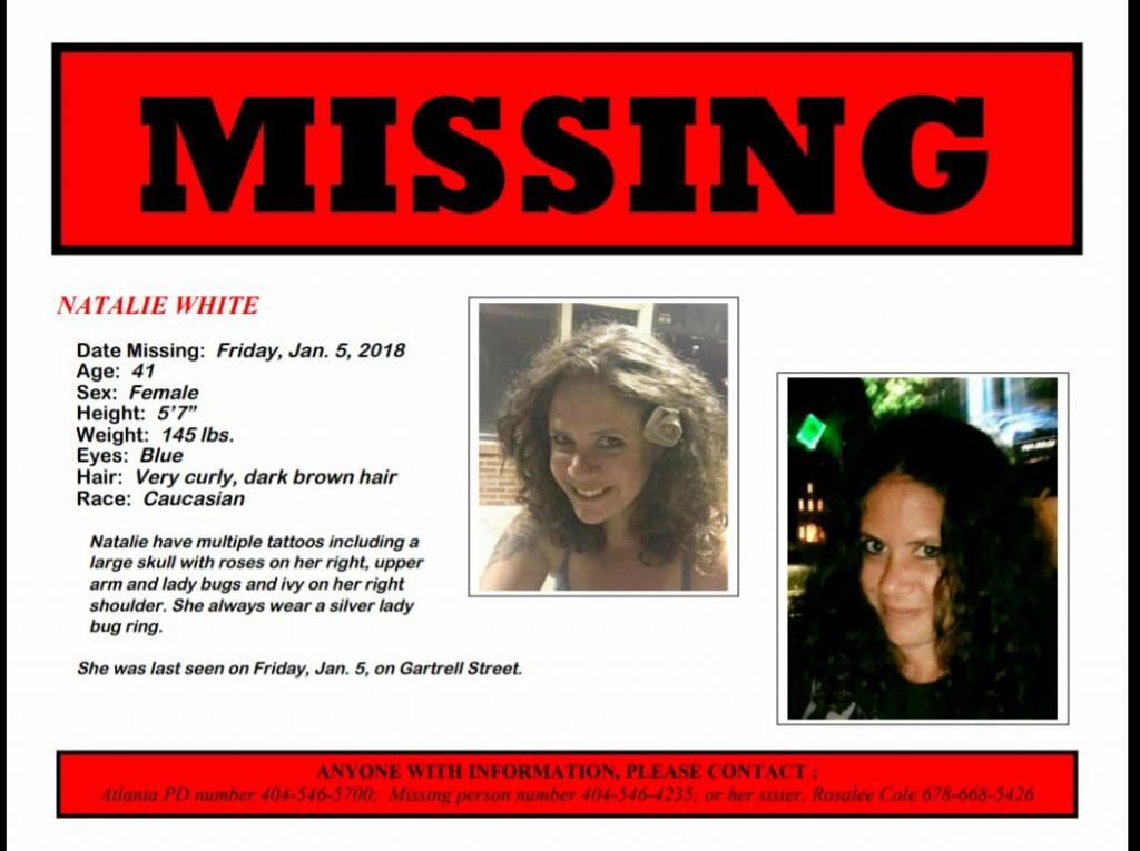[FONT=&quot]Natalie White was last seen in the 1300 block of Piedmont Avenue in the late morning of Jan. 5, according to the Atlanta Police Department. She was reported missing by her sister, investigators said.[/FONT]