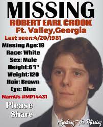 Crook was reported to have left Houston County, Georgia on the night of April 17, 1981. He was possibly operating his deceased father's 1971/1973 Buick Electra at the time.