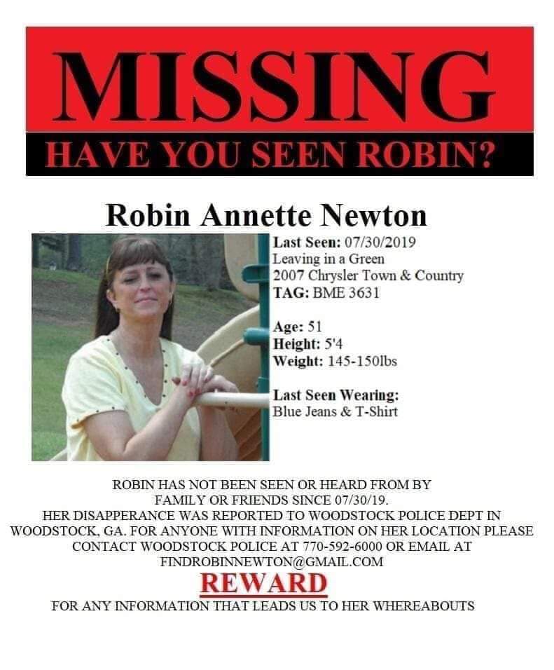 Woodstock Police say that 51-year-old Robin Newton was last seen in the town on Tuesday, July 30. Police said she left in a green 2007 Chrysler Towne & Country. The van has a Georgia tag that reads BME 3631.