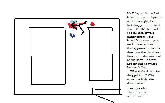 Went back and reviewed Sworn Part 2. From what I heard in that episode... RD was found in a "lying" position but SS believes RD (at some point) was either propped or fell against one of the vehicles. And possibly his head was removed and placed by the body for a time. **Also blood droplets had no tails... What does this suggest? The killer was careful in moving head from body and blood was in simple, single drops???
