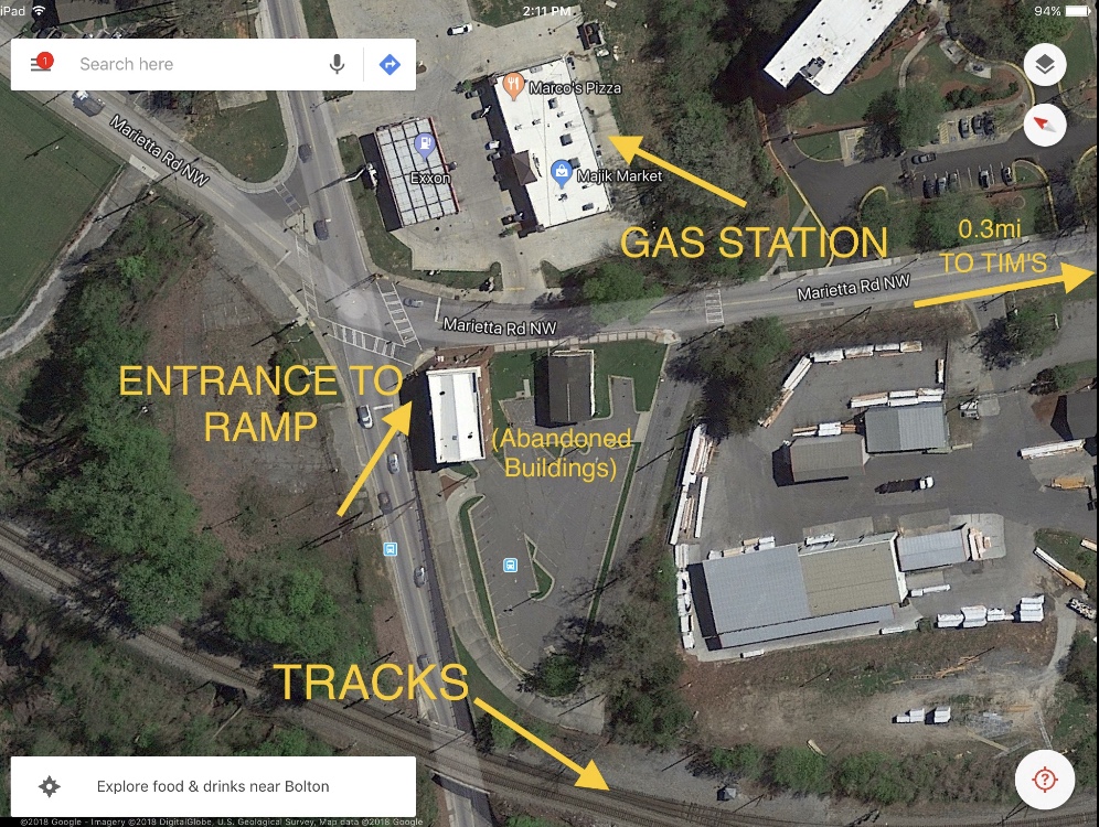 I did not think about the tracks over the river, but Gray is right. They are an easy walk from Tim’s, and that ramp is almost certainly within camera range of the gas station on the corner. The bridge itself would definitely be a place you wouldn’t be seen. I wonder if there is any way to tell how high it is?