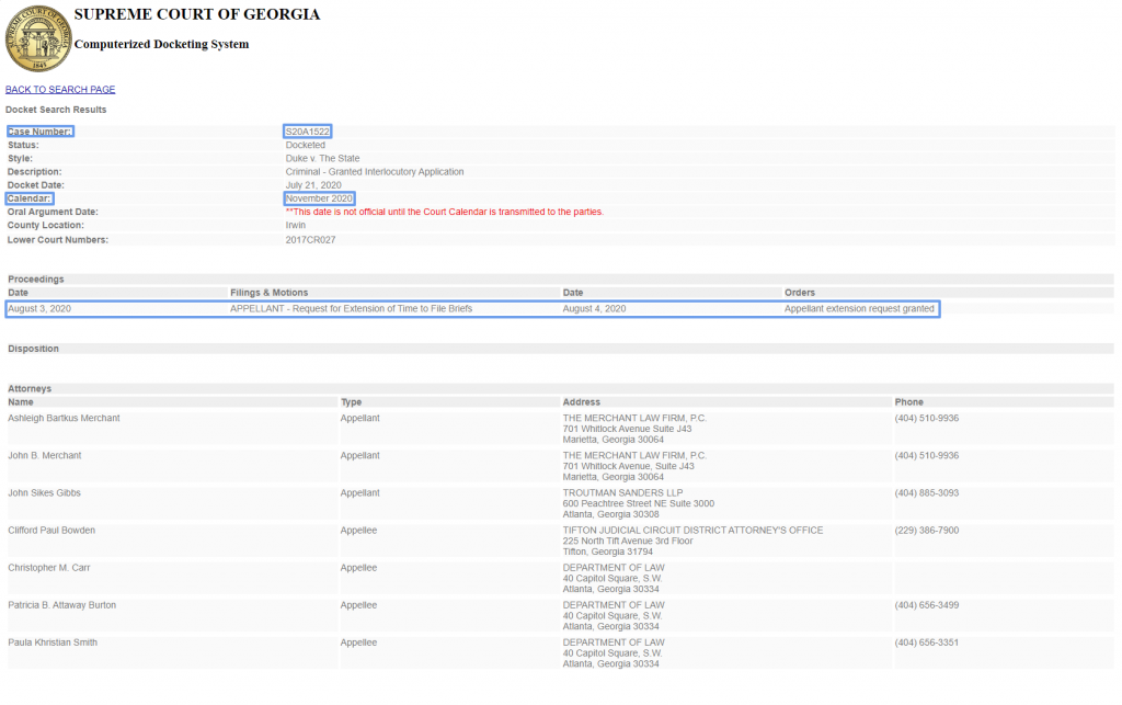 1/23/20 Update: Duke's attorneys filed an application for interlocutory review. They're requesting the Georgia Supreme Court to appeal Irwin County Superior Court's ruling that Duke's attorneys not receive state funding for experts and investigators to assist in his case. GA Supreme Court will hear case sometime in May, 2020. Ryan's case should be placed on the calendar for May within 20 days of being docketed so hopefully we'll have date by, or before 2/9/20. Once the Court hears oral arguments, an opinion will be issued in one to five months.