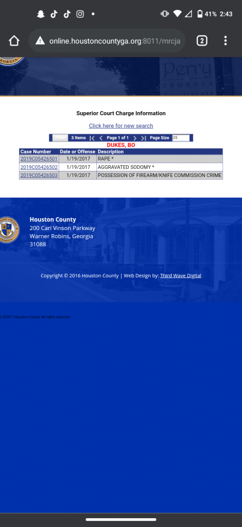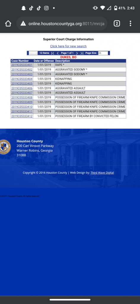 2 ladies (Jan. 1, 2019) -*Bo Dukes (34 @ time of crime/now 37) charged (1/6/19), indicted (1/15/19) & arraigned (2/17/19) with 1 count of rape (2019), 2 counts for aggravated sodomy, 2 counts for kidnapping, 2 counts for aggravated assault, 4 counts for possession of firearm/knife commission of crime & 1 count for possession of firearm/knife by convicted felon. Plead not guilty. Held without bond.