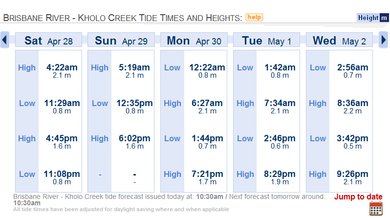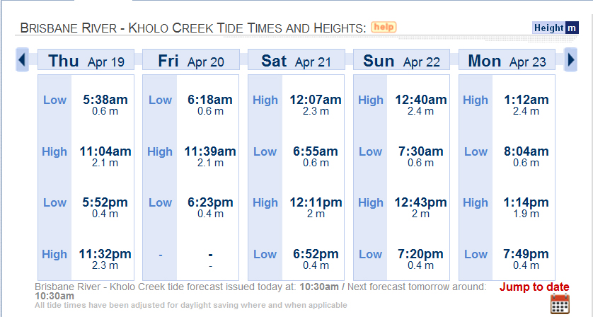 Kholo Creek tide chart 19 April 2012.