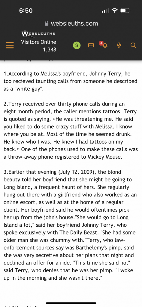 So I’ve been going back through the old LISK forums just to see if there’s anything that jumps out to me and I saw this post. My apologies if it has already been answered, but does anyone know if this is true? Did they ever confirm if Melissa’s boyfriend/pimp at the time really could have been contacted by this dude?