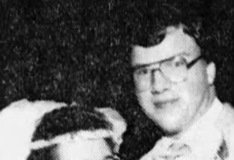This is his 1990 wedding announcement to the first wife that took place at St Peter's Church. I've cropped the photo to only show the top of her forehead, hair and bridal veil in order to provide a comparison in their heights.