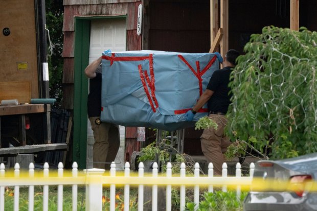 A refrigerator and a freezer were wheeled out of the house into vans around 2 p.m.