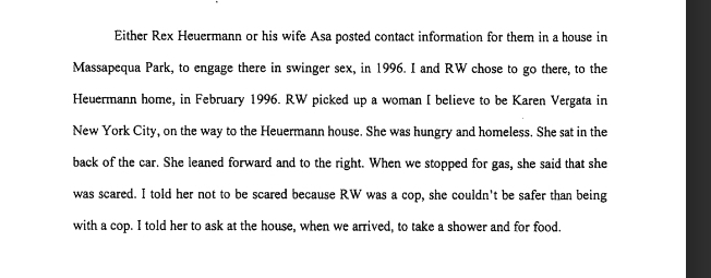 We learn today that one of the witnesses, who signed an affidavit, was taken to Heuermanns house along with Karen Vergata by a NYPD narcotics cop. Fun fact: Rodney Harrison is a former NYPD undercover narcotics cop. I know the witness says that they found Heuermann's house from a listing at the singers club but who saw that listing - the cop? Had he been there before? Why would this cop want to leave Karen Vergata who was clearly in distress according to the witness.