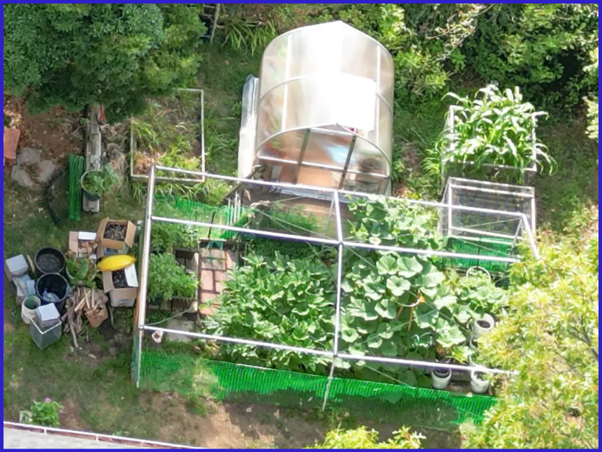 It makes me wonder who the gardener is in the family, since I see 2 greenhouses (one still in use as a greenhouse), some very healthy corn, some squash, cucumbers, tomatoes and what also look like beans. Some cold frames, trellises and raised beds and a variety of pots, pest fencing, bamboo stakes, etc.