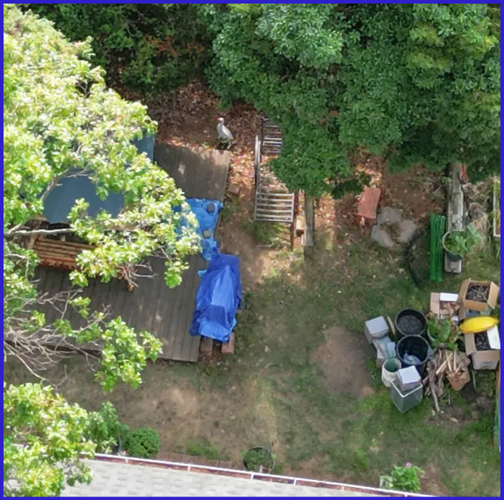 Pumpkin, corn...something else leafy that doesn't quite look like rhubarb, maybe some kind of brassica. Celery... something feathery, anyway, on the left. The greenhouse/poly tunnel in the centre looks in good condition, that plastic sheeting doesn't last forever and there is no buildup of leaf litter on top despite the mature trees around.I agree. Someone's a gardener and probably composts. Looks like they're into growing food.