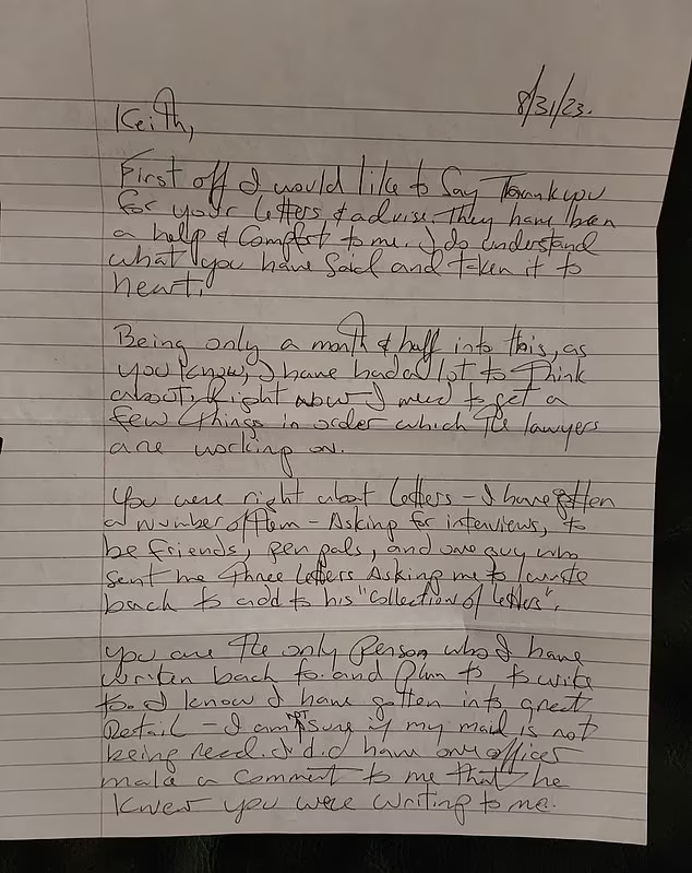 Heuerman thanks Jesperson for the "advice". He's not sure if his letters are being read but he thinks so because an "officer" made a comment to him. He seems to be sitting on whatever Jesperson told him. It took him a while to write back and he apologizes for that. Says he knows everything is about the "timing" in regards to the case and as of 8/31/23 he didn't know what LE knew or found yet.