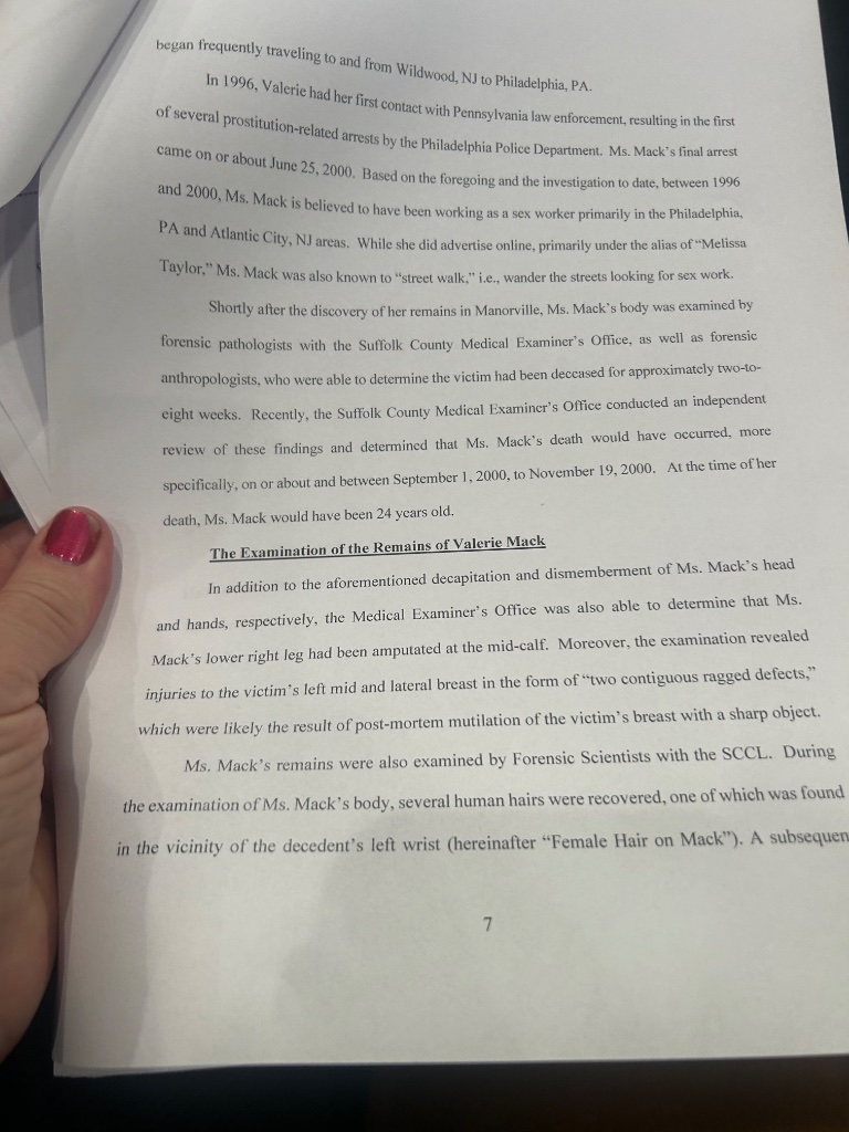 #New Female hair found on #LISK victim #ValerieMack’s wrist tied genetically to daughter of accused #GilgoBeach killer #RexHeuermann, according to superseding indictment. In 2000, defendant’s daughter only 2 or 3 years old, suggesting household hair transfer.