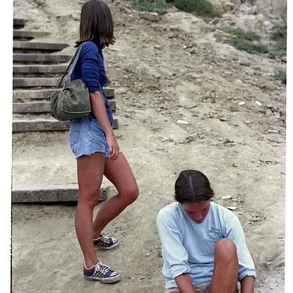 It's located in the green undergrowth directly to the right of the girl in the blue denim shorts.