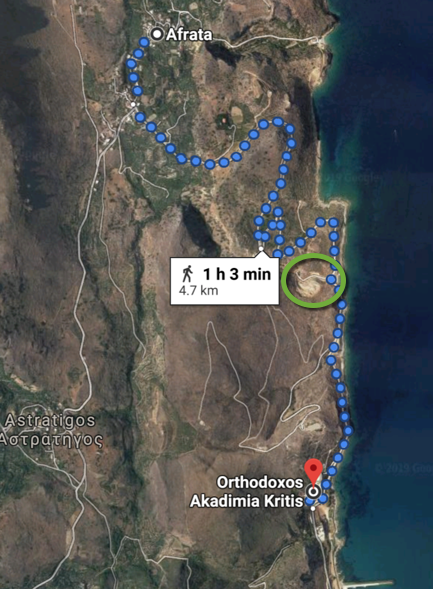 It's 3 miles from Afrata to the academy, and I agree that the Orthodox Church looks to be closer to the 1.5 to 2 mile mark.