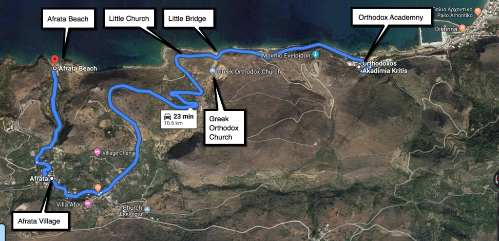 It's not stated very clearly on the video. Perhaps she walked through the village and started walking in the direction of the Afrata beach then she turned around to return to the OAC, so she may have walked through the village twice. What's important is that we know for a fact that she was on her way back to Kolymbari.