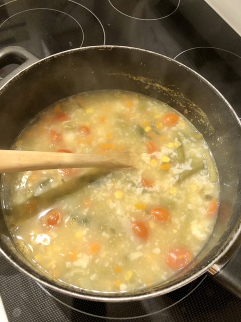 Soup’s on! Took whatever veggies I had on hand, chopped them up, poured them into 2 cartons of veggie broth. Then when the veggies were about soft, I added 1 cup of rice. Let it cook until the rice is soft.