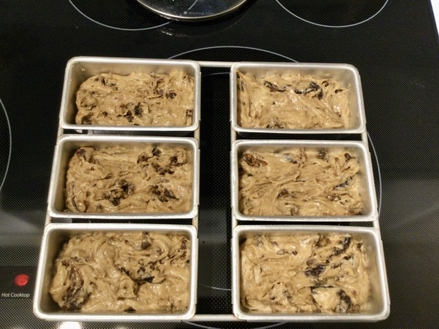 It is in the oven! I added 1/4 teaspoon nutmeg and just over 1/4 teaspoon cinnamon. It makes 6 little mini loaves which is what I expected. This is our preferred method of bread baking. Gluten free bread has to bake longer. A big loaf means it is too done on the outside for our liking. Then the middle is sometimes underdone.
