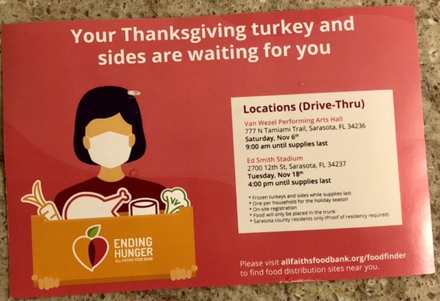 If you know anyone in the Sarasota FL area who qualifies for the food bank distributions, this is the post card I received yesterday. It’s a frozen turkey, fresh veggies and dry goods like stuffing mix and canned yams. I can’t remember everything they gave us but that’s the bulk of it.