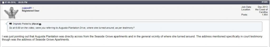 Here's a screenshot of a post where we know that per (someone's?) testimony, her phone turned around at Seaside Grove Apartments and headed back to LB's.