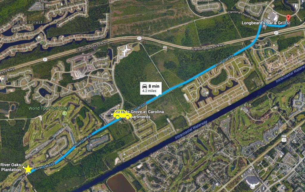 Here's a map that shows Heather's apartment (yellow star), Seaside Grove Apts (yellow car), and Longbeard's (red marker).