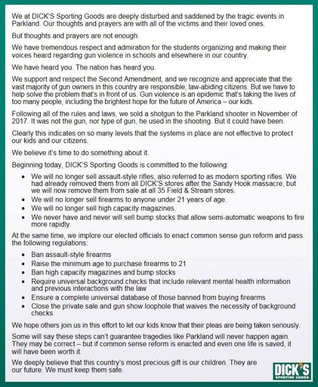 Their statement is a bold statement. If they were being merely political, or bottom line driven, they might not have adopted this stance. In their attached statement, they are calling for what most people are calling for. And maybe they are as wary as those school kids, too. How many more of these massacres can we endure while waiting for some common sense action...