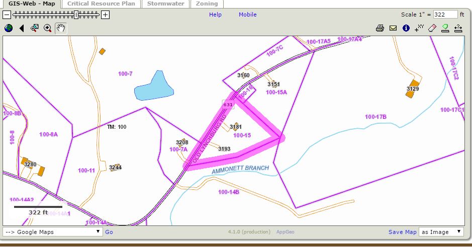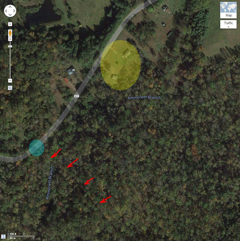 Hmmm, that doesn't "look" right. I am looking at a property that is 135' deep (where I live) and there's no way that Ammonett Creek is only 150' from the cabin. Using the road as a guide (which is probably about 20' wide), the Ammonett Creek seems much farther away from both houses. JMO