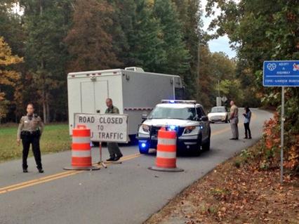 A number of police vehicles going past barrier at Red Hill Rd and Old Lynchburg incl. this big white truck. @CBS19