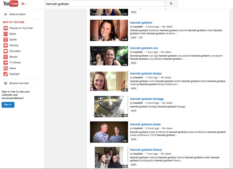 Last night Evie Ivy Over and I were watching Hannah's you tube accounts. I had to bounce it off her to make sure I was not going crazy! You can see from the picture someone took over all of Hannah's video's on you tube, their account is now suspended. It appears the you tube video's were hacked. Notice "all" of the posts had been changed to "lisadefer" as the poster, as many of you have been watching the Hannah Graham case know this is not correct. I took a snappy - it's posted below.
