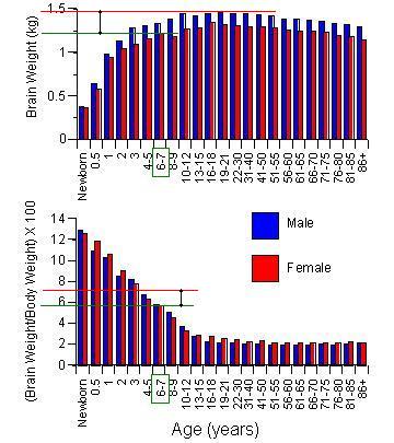 Here are two charts showing average brain weights by age (one is by weight alone, while the other shows it as a ratio to body weight). I’ve added a green line showing where a 6 yo female should be on the scale and a red line to indicate JonBenet’s brain weight as measured during autopsy:
