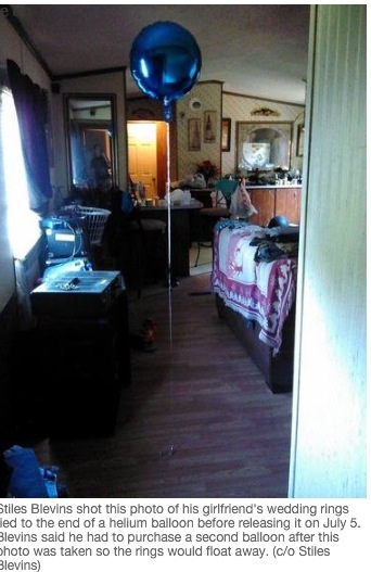 Tuscaloosa, Alabama woman Caley Burkett decided to take to the skies with her rings from her failed marriage. She and her new partner, Stiles Blevins, tied them to a helium balloon in a little ceremony marking a final farewell to the old marriage, and waited for them to be gone forever.