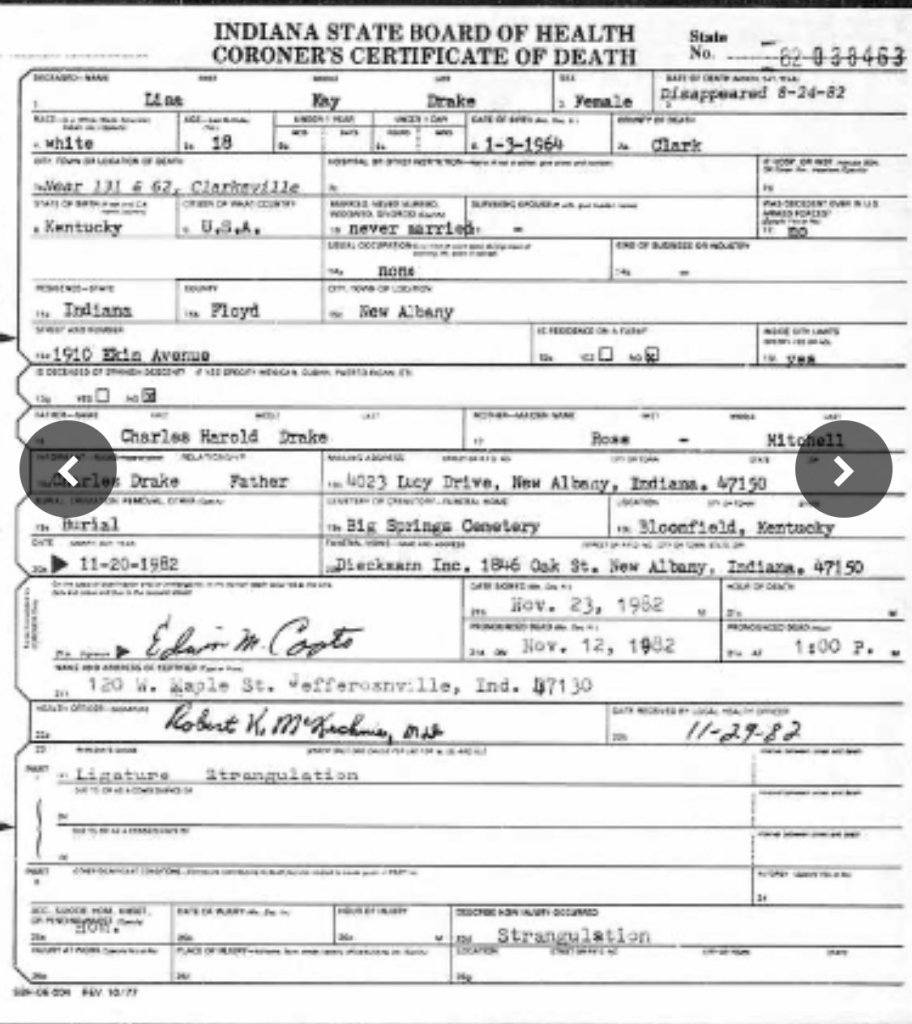 Her name was Lisa Kay Drake, 18, found in 1989 in Indiana- she was reported missing but found a few months later. My friend who is related is just curious to know what happened to her. I can not locate anything save for her death certificate that lists her death as ligature strangulation.