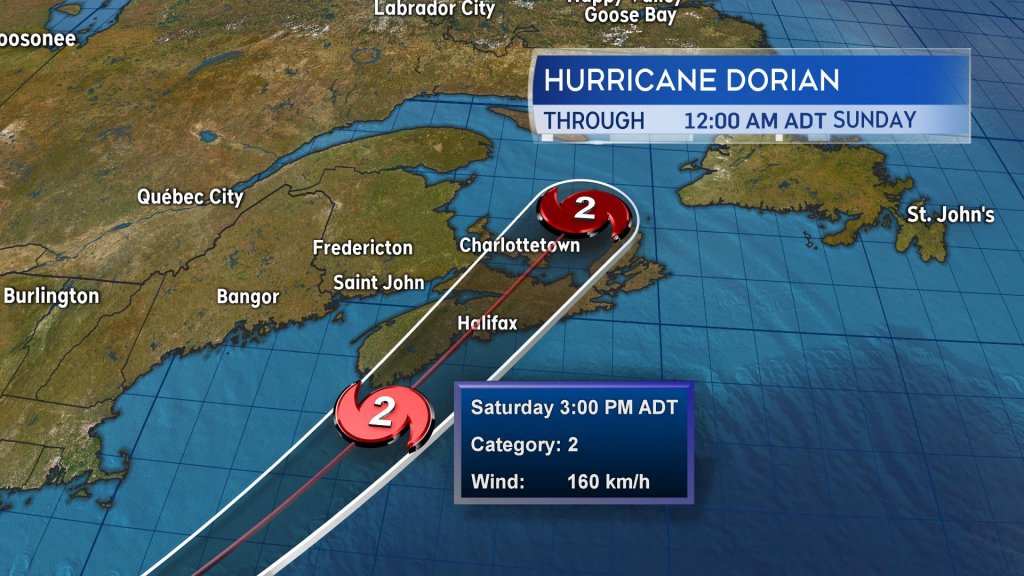 As of 2 p.m. Friday, Dorian was centered about 125 miles northeast of Cape Hatteras, N.C., with sustained winds of 90 mph.. Tropical storm-force winds extend up to 220 miles from the center, but hurricane-force winds only extend up to 75 miles.