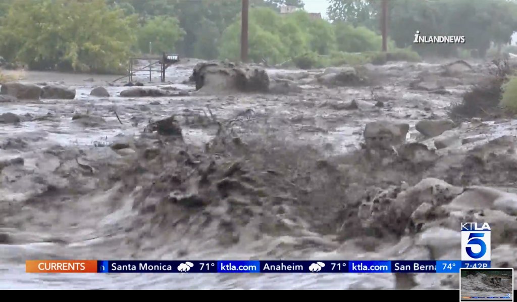 Ah, Yucaipa. Nothing has grown back from the fires in the area. That's got to be a mess. Nothing to slow the water down and it's all going to flow down the mountain. I feel so bad for everyone on the downside of that.There is ongoing live reporting here, I took a screen shot: