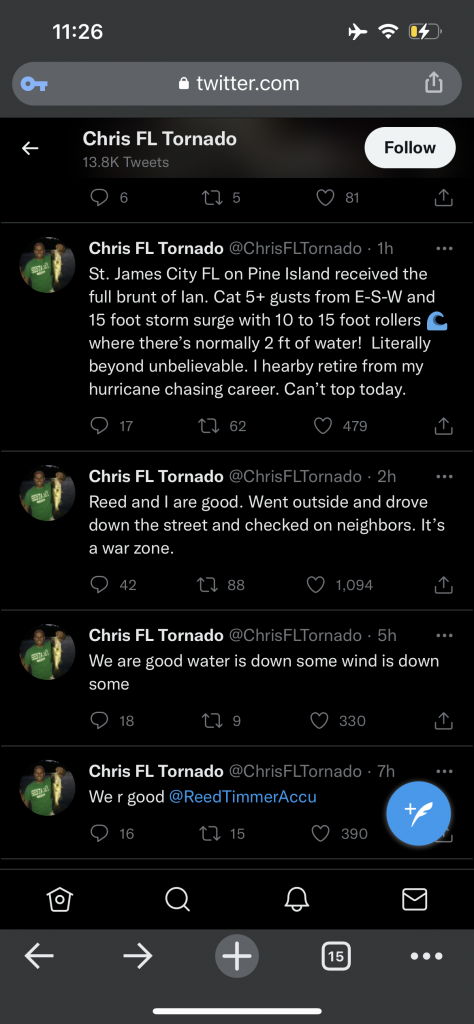 St. James City FL on Pine Island received the full brunt of Ian. Cat 5+ gusts from E-S-W and 15 foot storm surge with 10 to 15 foot rollers where there’s normally 2 ft of water! Literally beyond unbelievable. I hearby retire from my hurricane chasing career. Can’t top today