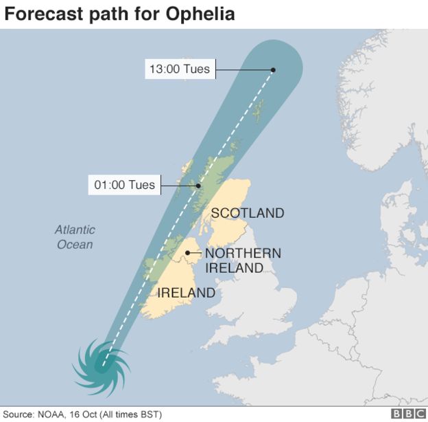 • Winds in excess of 80mph (130km/h) are expected as the remnants of Hurricane Ophelia head towards the UK from the Atlantic Ocean
