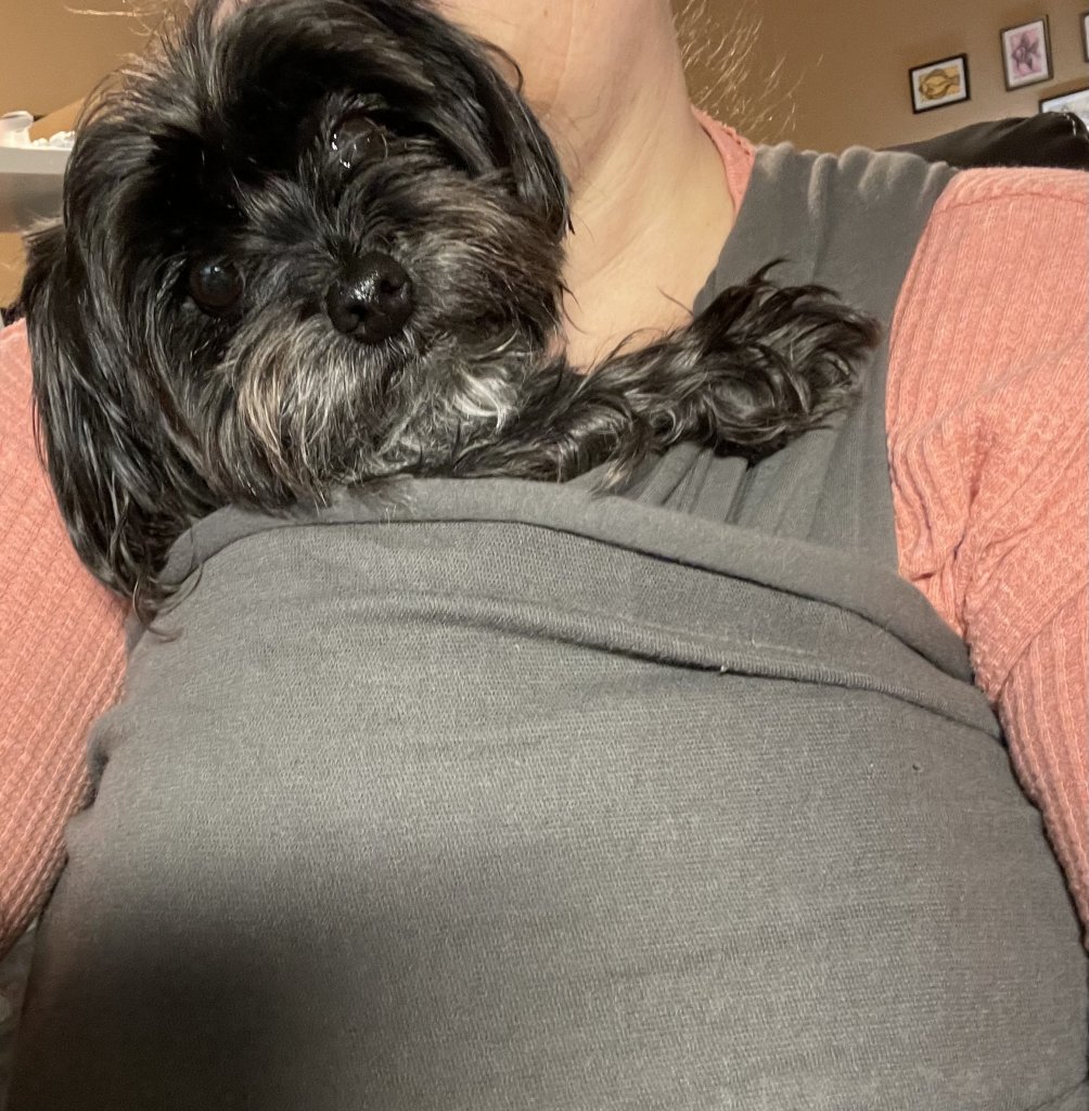 It’s like a 6lb Morkie shaking like a leaf, attached to you in a baby carrier so he doesn’t have an aneurysm from the big scary wind noise. Fun times.