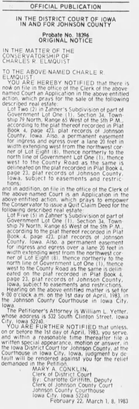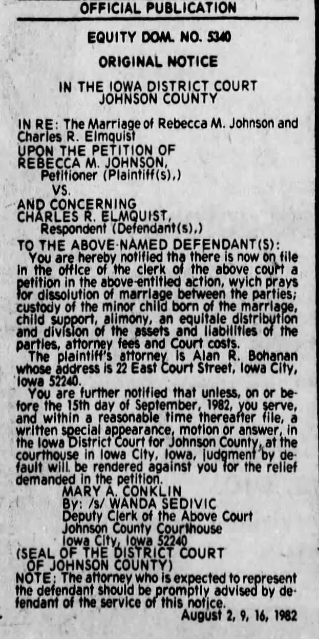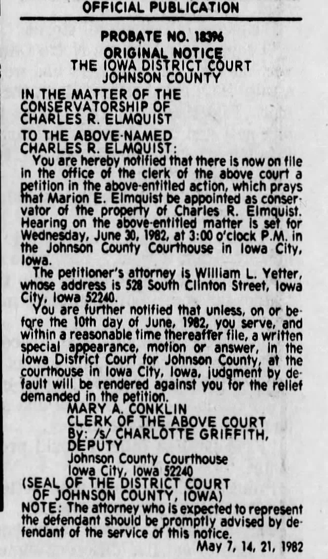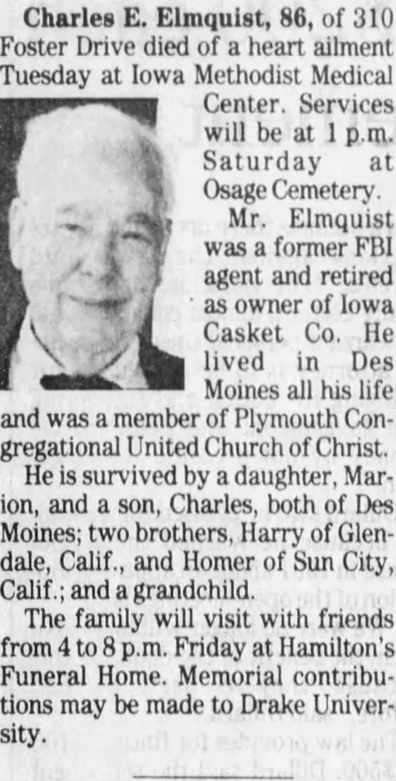 Elmquist disappeared from Iowa City, Iowa on November 16, 1979. He has never been heard from again. The following day, his blue 1961 GMC van was found parked in the University of Iowa Hydraulics Laboratory storage lot. Elmquist's case remains unsolved.