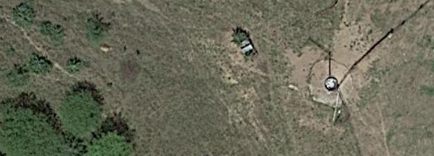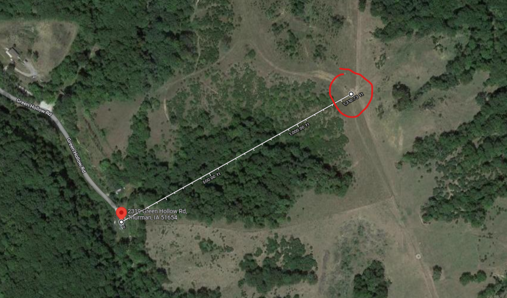 And I do see a couple areas of interest here. This area for example. It sits a quarter mile NE of the trailer. The round object (per Google's measure tool) is 6 feet in diameter. It might actually be covering an old well, or it might be something else entirely, I can't tell. There's another round object south of this along the same path.